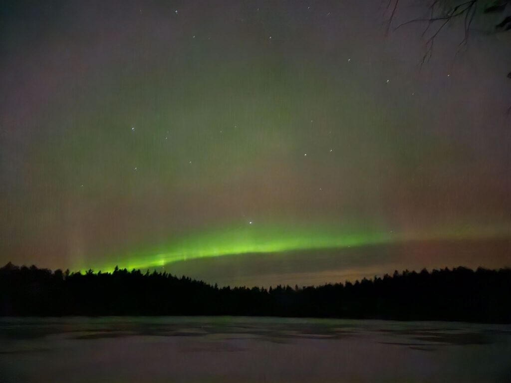 Suo oli paras paikka. Joissakin kohdissa jäätyneen suon jääkannen alta oli noussut jäälle ruskeaa suovettä, joka oli jäätynyt hassuiksi punaruskeiksi patjoiksi. En ole ennen nähnyt sellaisia, joten se oli aika hauskaa. Myös tähtitaivas oli hurjan hieno ja yhtenä iltana näimme revontuliakin.