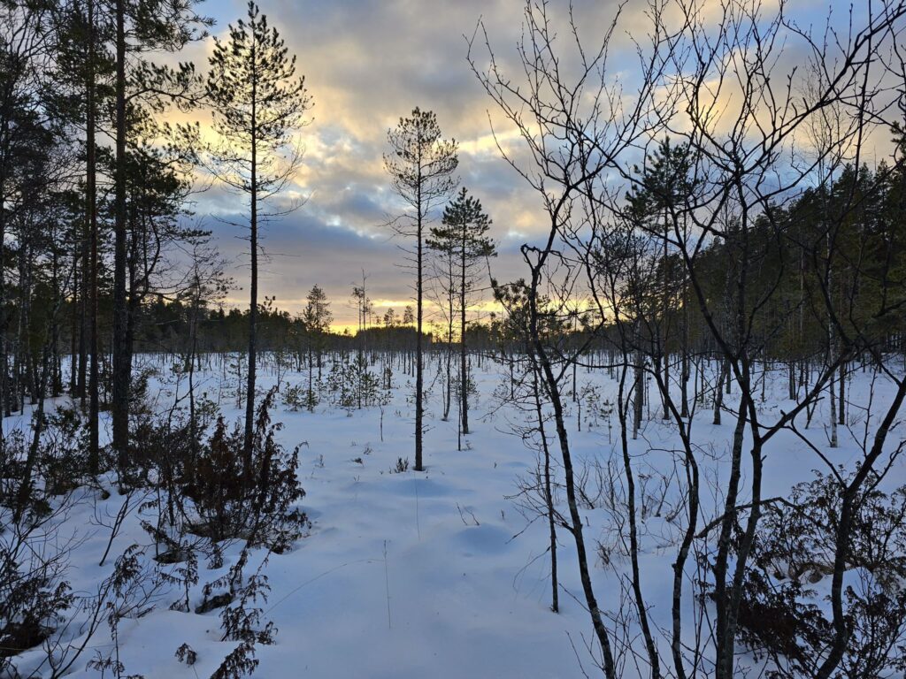 Luontoliiton Uudenmaan piirin perinteisellä uudenvuoden retkellä Salamajärven Sysilammilla ohjelmaan kuuluivat päiväretket kävellen, lumikengillä ja hiihtäen. Retkikonkari Kati Schenk kertoo, miksi villaviitta on hyvä vaate ja mikä talvisella suolla oli erityisen kaunista.