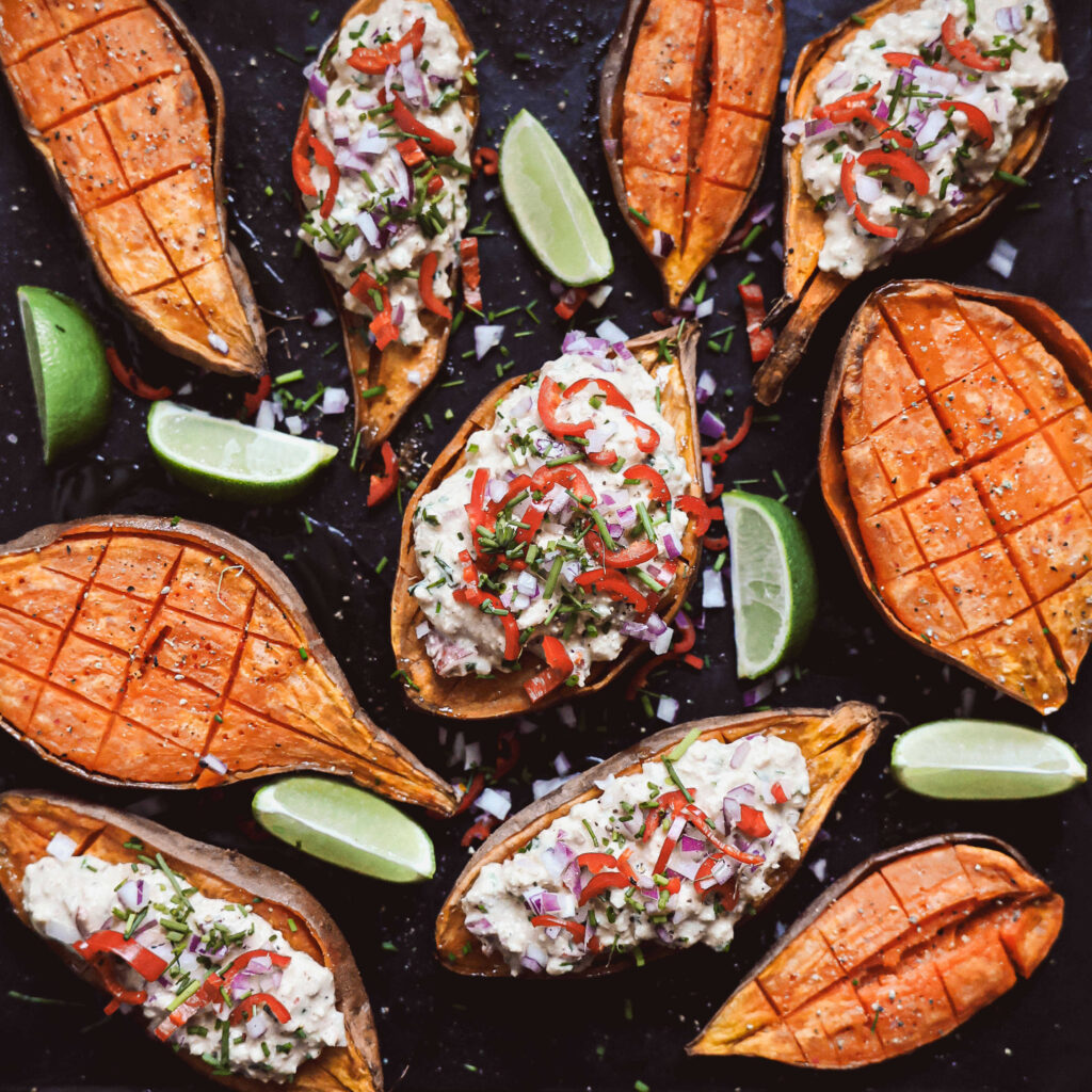 Valmista täyte samalla, kun bataatit paistuvat. Silppua punasipuli, chili ja yrtit. Sekoita ne sekä soijakastike, suola, mustapippuri ja kasvipohjainen ranskankerma kulhossa. Murustele joukkoon savutofu ja purista limestä mukaan vielä mehu. Lado täyte kypsien bataattien päälle ja koristele halutessasi chilillä, punasipulilla tai ruohosipulilla.