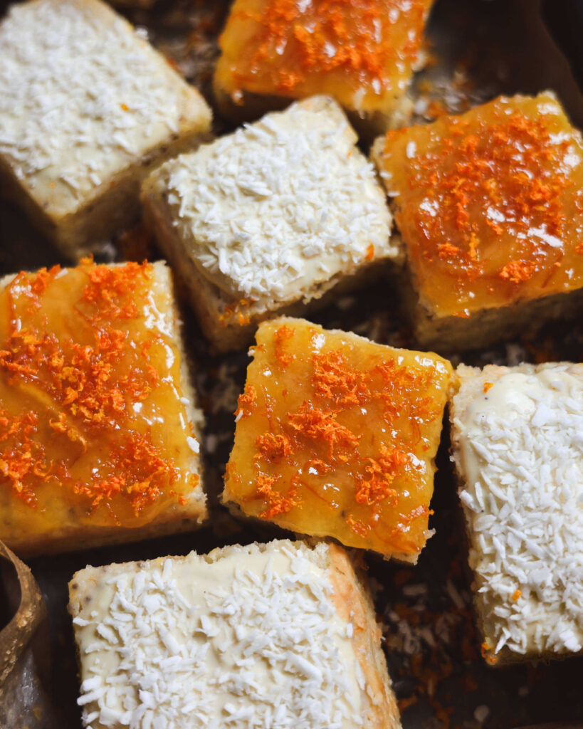 Anna peltikakun jäähtyä ja leikkaa se sitten neliönmuotoisiksi leivoksiksi. Koristele leivokset halutessasi appelsiinimarmeladilla ja raastetulla appelsiininkuorella tai vaniljanmakuisella soijajogurtilla ja kookoshiutaleilla.