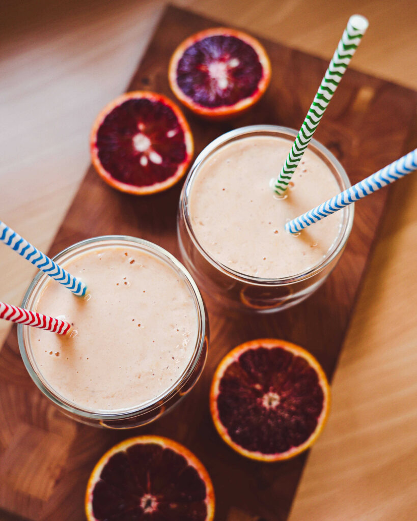 Aurinkoisesta mangosta ja veriappelsiineista saa oivan välipalasmoothien tai helpotuksen makeanhimoon.