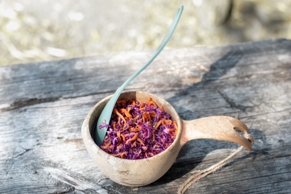 Kuori tai pese porkkanat, ja raasta ne karkeaksi raasteeksi tai pilko ohuiksi suikaleiksi. Pilko tai raasta punakaali esimerkiksi juustohöylällä ohuiksi suikaleiksi. Pilko halutessasi tuore chili ohuiksi viipaleiksi. Levitä punakaali, porkkanat ja tuore chili tai jalapenoviipaleet tasaisesti kuivattavaksi.