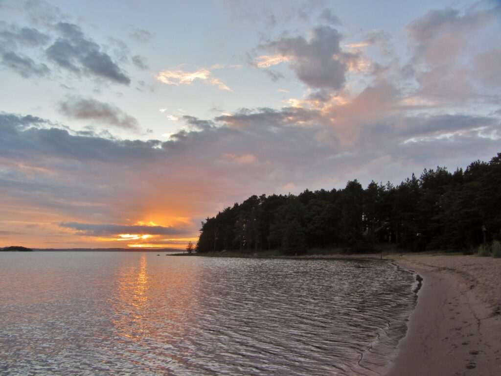 Saavun illan ensimmäiselle retkikohteelleni jo ennen kuin aurinko on ehtinyt painua taivaanrannan taakse. Tämä on Mustfinnin uimaranta, kaunis pieni biitsi Paraisten länsilaidalla, Airiston laivaväylän äärellä. Lämpimänä poutapäivänä ranta olisi täynnä uimareita, mutta nyt paikalla ei ole ketään. Laskeva aurinko leimuaa punaisena, pilvet hehkuvat ja meri kimaltaa auringonlaskun kultaa. Tunnelma on epätodellisen kaunis.