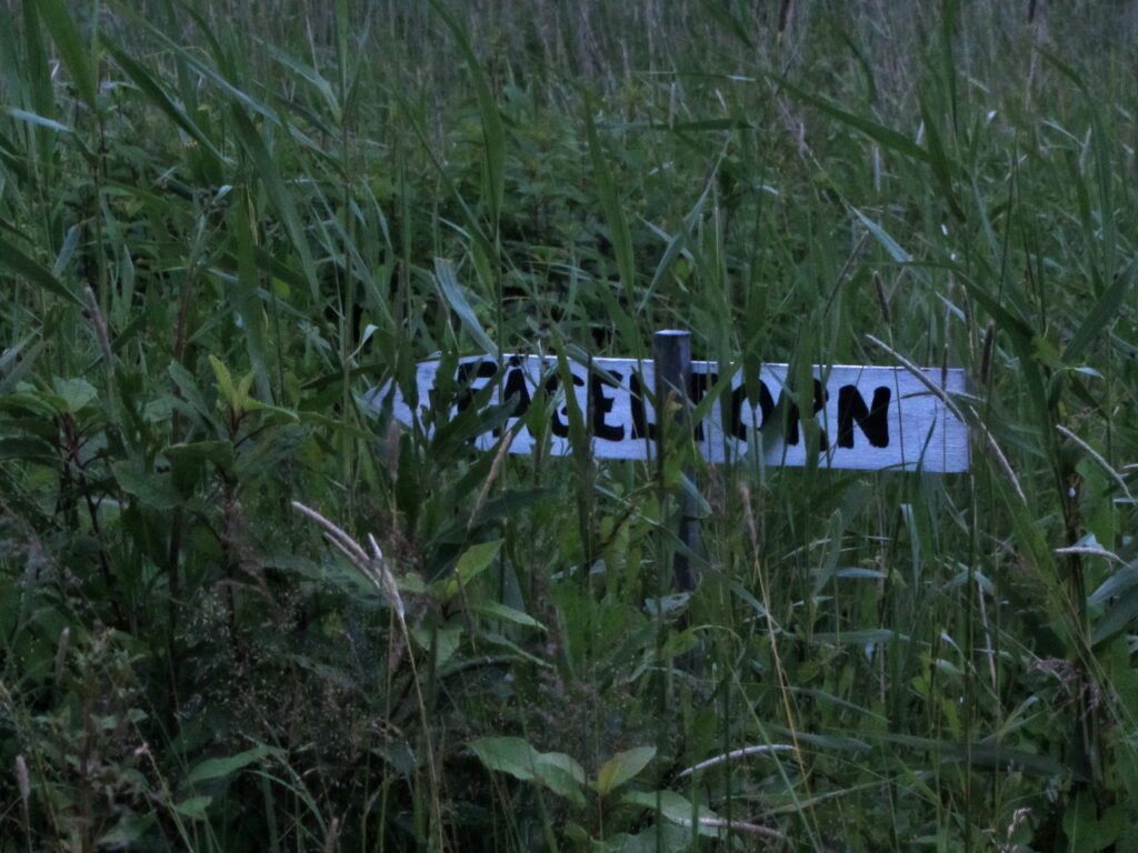 Pettebyn tornille vievää pikkutietä on aluksi vaikea havaita. Se poikkeaa päätieltä sankan pusikon kohdalla. Vasta kerran ohitettuani ja takaisin käännyttyäni havaitsen pensaiden varjoon kätkeytyvän tienristeyksen ja lintutornille opastavan kyltin ruovikon seassa.