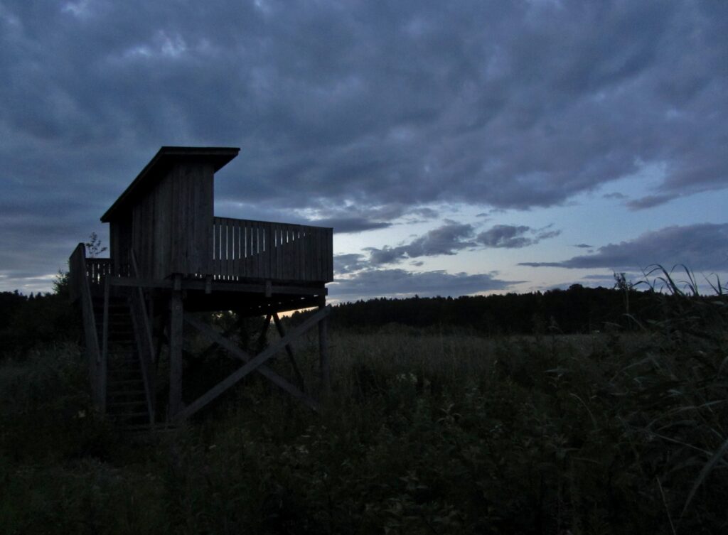 Lähden rannalta vasta, kun alkaa hämärtää. Seuraava kohteeni on Pettebyn lintutorni. Ennen tätä iltaa en ollut kuullutkaan siitä – ei vain ollut tullut aiemmin mieleen etsiä lintutornia näiltä main. Matkalla jännittää, löydänkö perille ja minkälaiseen paikkaan olen menossa.