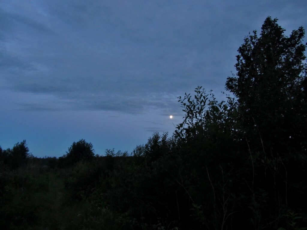 Päivän lämpö hiipuu hiljalleen, ja ilmaan nousee yön raikkaanviileä kosteus. Miltei täysi kuu kohoaa esiin metsän takaa. Kettu saalistaa pellolla. Pari metsäkaurista ryntää tien yli vauhdikkain loikin. Sitten näen hirven, joka kaikessa rauhassa seisoskelee metsän reunassa pellon laidalla. Jään hetkeksi katsomaan suurta komeaa eläintä. Se ei reagoi minuun mitenkään. Käki kukkuu.