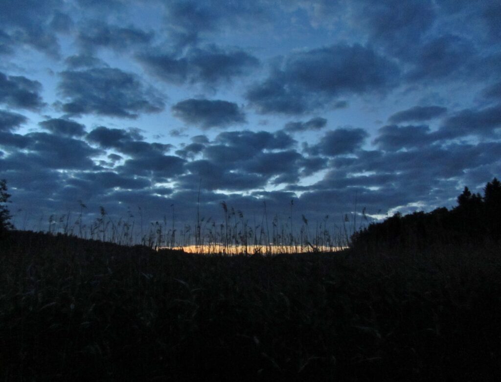 Pettebyviken on matala ja hyvin ruovikkoinen merenlahti. Meri tuoksuu, mutta saan näköyhteyden veteen vasta, kun nousen lintutorniin. Torni on matala, yksikerroksinen ja oikein mukava. Istahdan hetkeksi penkille kuuntelemaan kerttusten kiihkeää laulantaa ja kiikaroimaan ruovikon takana lahdella kelluvia vesilintuja. Alkaa olla jo niin hämärää, että pystyn erottamaan kunnolla vain joutsenet isoina valkoisina möhkäleinä tummassa vedessä.