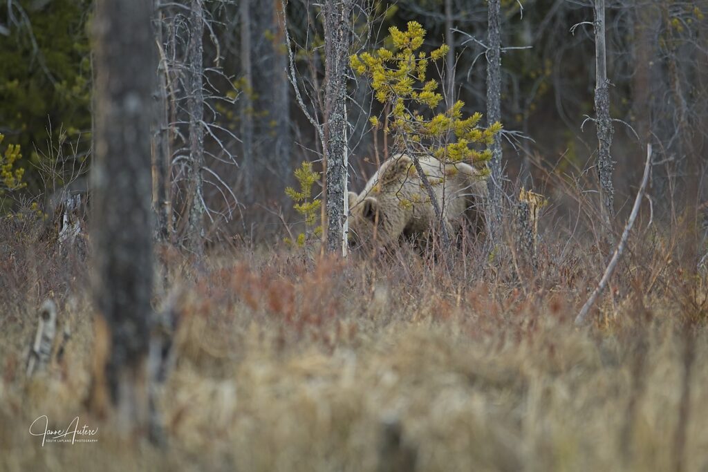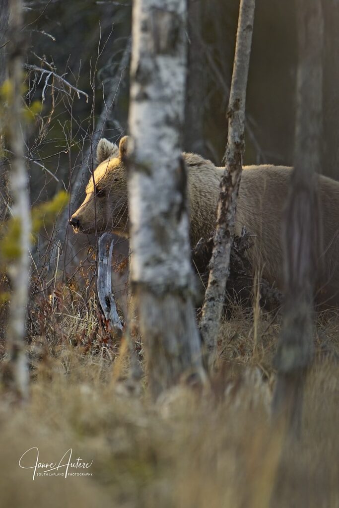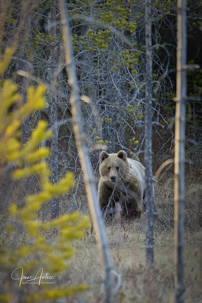 Kun karhu tuli majavan padolle ja näytti suunnittelevan uimaan menoa, päätin näyttäytyä hänelle. Nousin ja aloin rauhassa keräämään tavaroitani ja karhu poistui nopeasti puiden taakse, johon se jäi katsomaan kun lähdin kävelemään pois päin. Otin vielä yhden kuvan kun karhu katsoi puiden välistä minua suoraan silmiin.