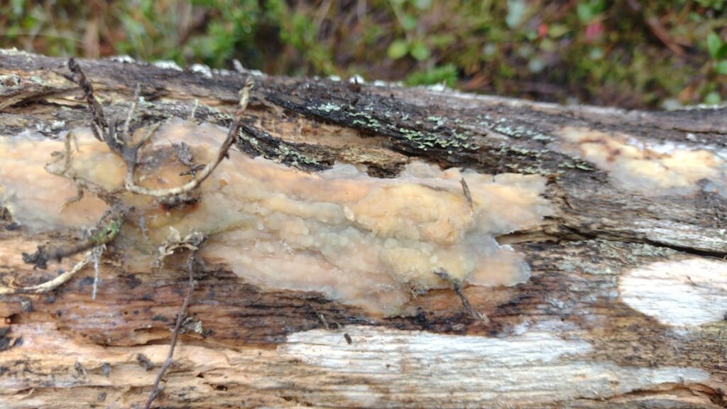 Päivän reitti kulki jängällä pienten kangasmetsäsaarekkeiden läpi. Pysähdyimme kartoitusparini kanssa kaatuneelle kelolle istumaan ja syömään eväitä. Ihastelimme metsää ja sen monisatavuotiaita mäntyjä, järeitä lahopuita ja käppyräisiä aavemaisia keloja. Ehdimme evästauon verran hehkuttaa luonnonmetsän kauneutta ja kun jatkoimme matkaa, heti seuraavaksi edessä aukesi nuori tasaikärakenteinen talousmetsä.