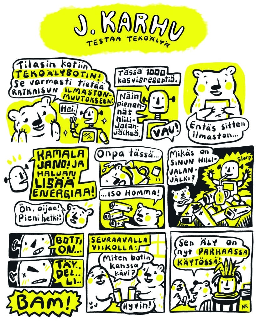 Se, onko tekoälystä lopulta enemmän hyötyä vai haittaa, riippuu osittain ihmisten tekemistä päätöksistä. “Aina tekoälyn tekijöillä tai käyttäjillä ei ole paha mielessä, mutta silti lopputulos on epätoivottu – esimerkiksi ihmisiä syrjivä tai epäkunnioittava”, sanoo Nelimarkka. Tämä riippuu muun muassa siitä, millaisella materiaalilla tekoälyä on koulutettu.